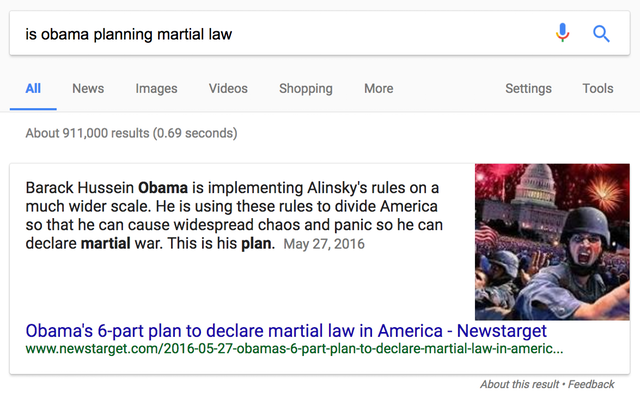 There are numerous examples of similar behavior. Adrianne Jefferies at The Outline details some more bad snippets, including this one claiming Obama is planning for martial law (complete fiction):