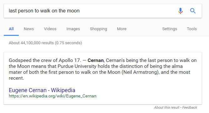 Sometimes Google does not pull out the answer but makes the answer apparent in the blurb or headline of the card, as in this answer to the query, “last person to walk on the moon”: