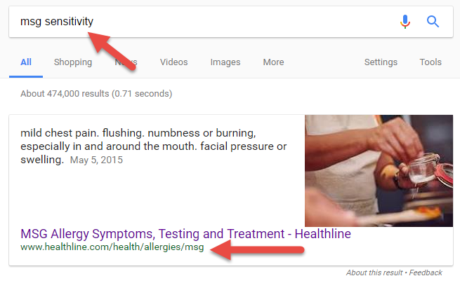 All this changes if you use the language of fringe groups that believe the medical community is suppressing a link between MSG and a variety of neurological disorders. Here’s what you get when you type in ‘msg dangers’: